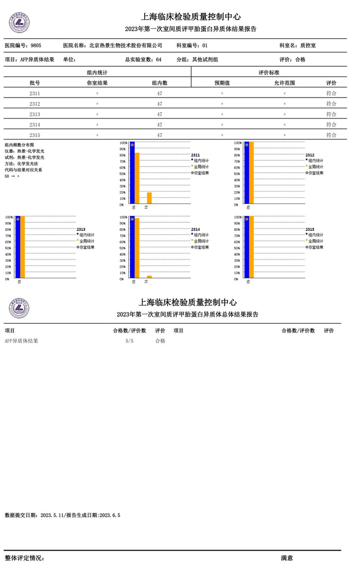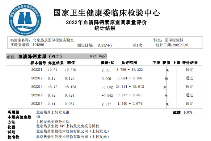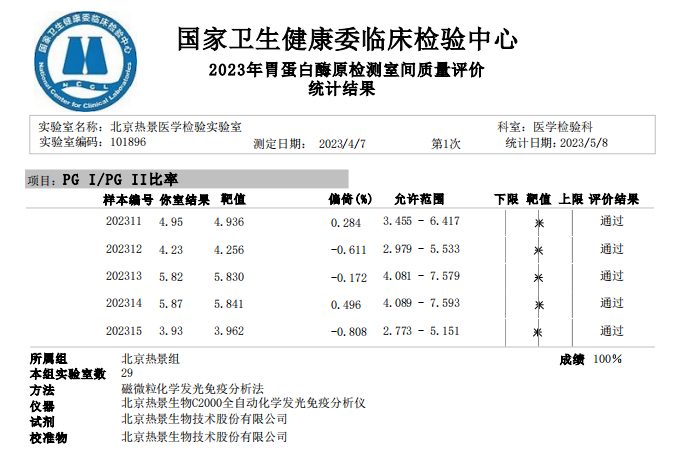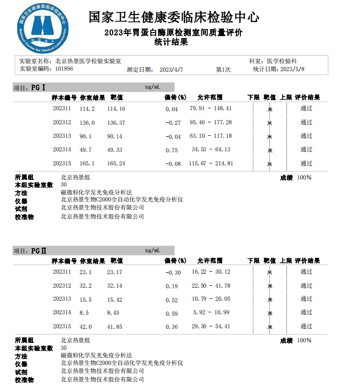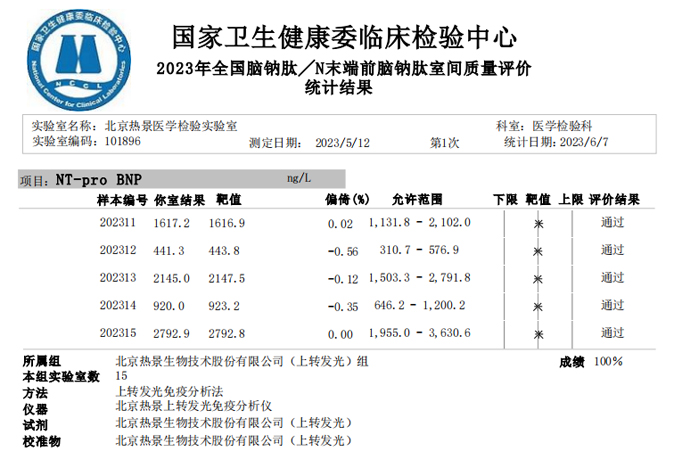 近日,國家衛生健康委臨床檢驗中心(NCCL)公布了2023年多項全國臨床檢驗室間質(zhì)量評價(jià)結果。熱景生物旗下熱景醫學(xué)檢驗實(shí)驗室以100分的優(yōu)異成績(jì)通過(guò)“胃蛋白酶原”“血清降鈣素原”“N末端前腦鈉肽”“心肌標志物”等室間質(zhì)評項目。同時(shí),熱景生物參與的上海市臨床檢驗中心2023年第一次能力驗證項目,包括B型鈉尿肽/N端-B型鈉尿肽前體、AFP異質(zhì)體比率、肌鈣蛋白I、降鈣素原等項目均通過(guò)驗證,充分彰顯了熱景生物穩定可靠的實(shí)驗室質(zhì)量管理和檢測能力,以及強大的產(chǎn)品和技術(shù)實(shí)力!