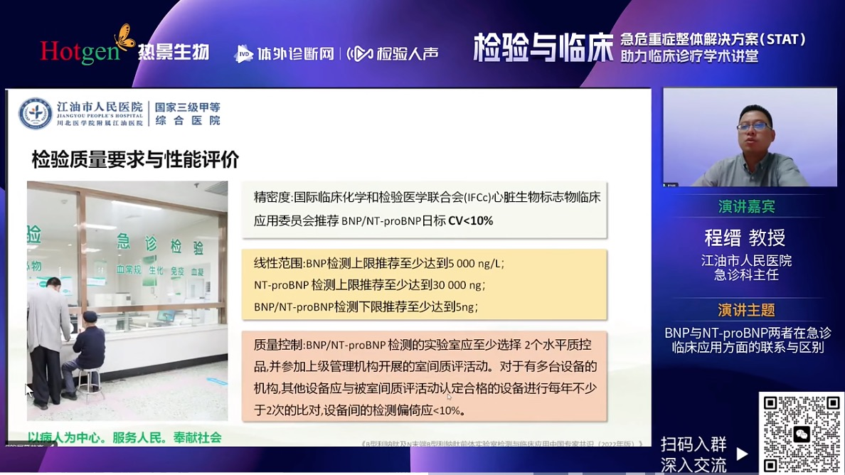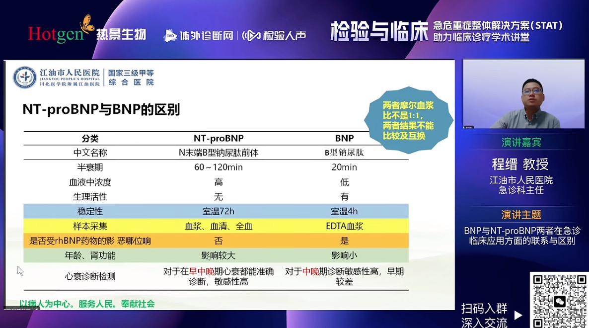四川省江油市人民醫院急診科程縉教授就BNP與NT-proBNP兩個(gè)指標進(jìn)行了深入剖析,從BNP與NT-proBNP病理生理機制出發(fā),解析了BNP和NT-proBNP之間的區別,全面的闡述了影響B(tài)NP和NT-proBNP水平的因素,又從檢驗角度強調BNP/NT-proBNP質(zhì)量要求和性能評價(jià)。最后程教授回歸臨床分享BNP/NT-proBNP在心衰早期篩查與一級預防、心衰的診斷與鑒別診斷和心衰治療監測和預后評估等臨床價(jià)值。