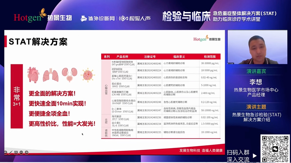 熱景生物醫學(xué)市場(chǎng)中心李想經(jīng)理根據臨床調研結果以及在急危重癥多樣化患者,分享熱景生物完整的急危重癥整體解決方案(STAT),并且分別闡述了不同場(chǎng)景匹配的解決方案,實(shí)現全血單人份10min準確報告出具,目前涵蓋心腦血管、炎癥以及腎損傷相關(guān)指標的全景解決方案,非常適用于胸痛中心、急診、ICU等臨床科室開(kāi)展。