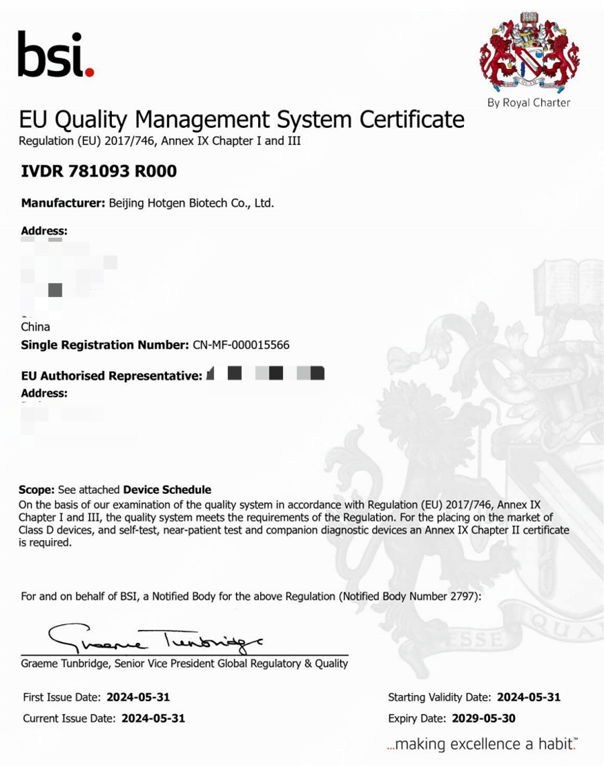 The Regulation (EU) 2017/746 (IVDR) is the new EU legislation for in-vitro diagnostic (IVD) medical devices. On May 26th, 2022, it fully applies across the European Union region. Under this stringent system, the 29 newly certified products include cardiac, hormones, inflammation, and cancer markers. This is an reiteration of Hotgen’s unwavering commitment to safety, quality, and effectiveness of diagnostic products, as well as loyalty to the demand of healthcare professionals and patients.