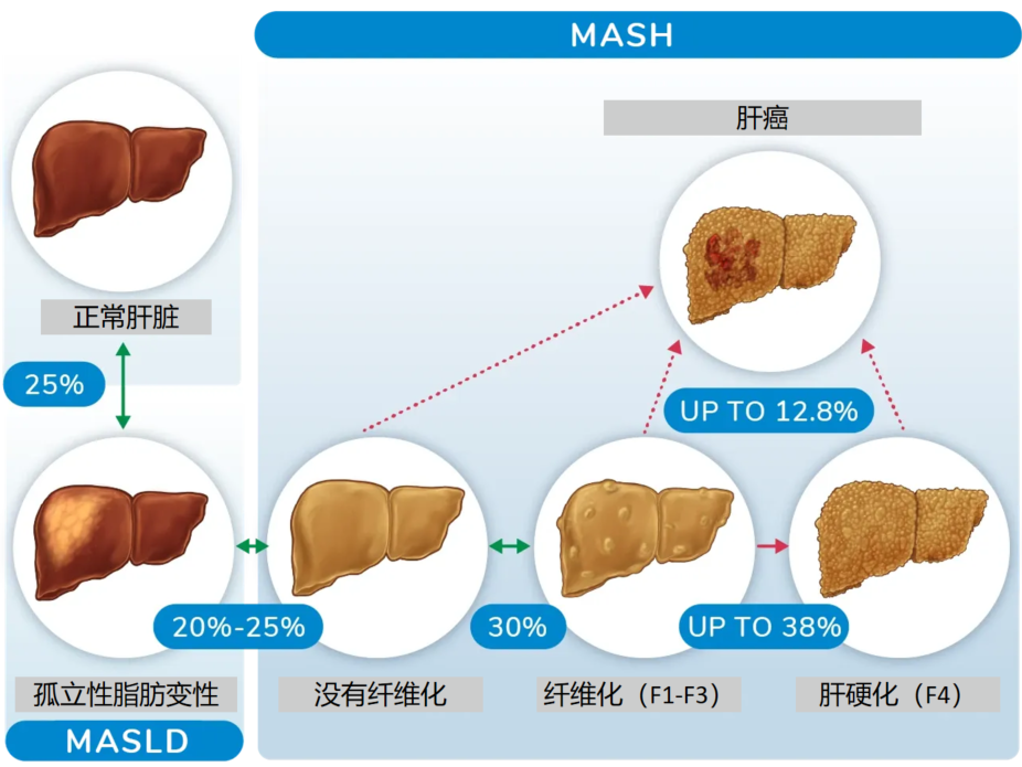 隨著(zhù)時(shí)間的推移,約有40%的MASH患者纖維化程度會(huì )不斷加重,其速度約為每十年進(jìn)展1個(gè)階段。MASH患者罹患肝細胞癌的幾率明顯高于普通人群,其年發(fā)病率是MASLD的12倍(5.77 vs. 0.44人/1000人)。長(cháng)期研究表明,與普通人群相比,MASH患者的總體死亡率和肝臟相關(guān)死亡率更高。由此,MASH已成為我國日益嚴峻的公共衛生問(wèn)題。