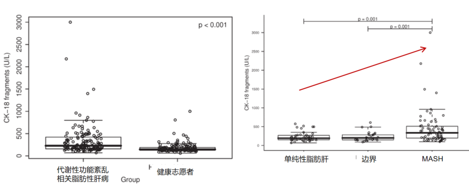 與健康人相比,MASLD患者血清CK18含量顯著(zhù)升高;與單純性脂肪變性和邊緣診斷患者相比,MASH患者血清CK18含量顯著(zhù)升高。MASH患者血液中CK-18片段顯著(zhù)增加,CK18是MASH的獨立預測因子[1]。