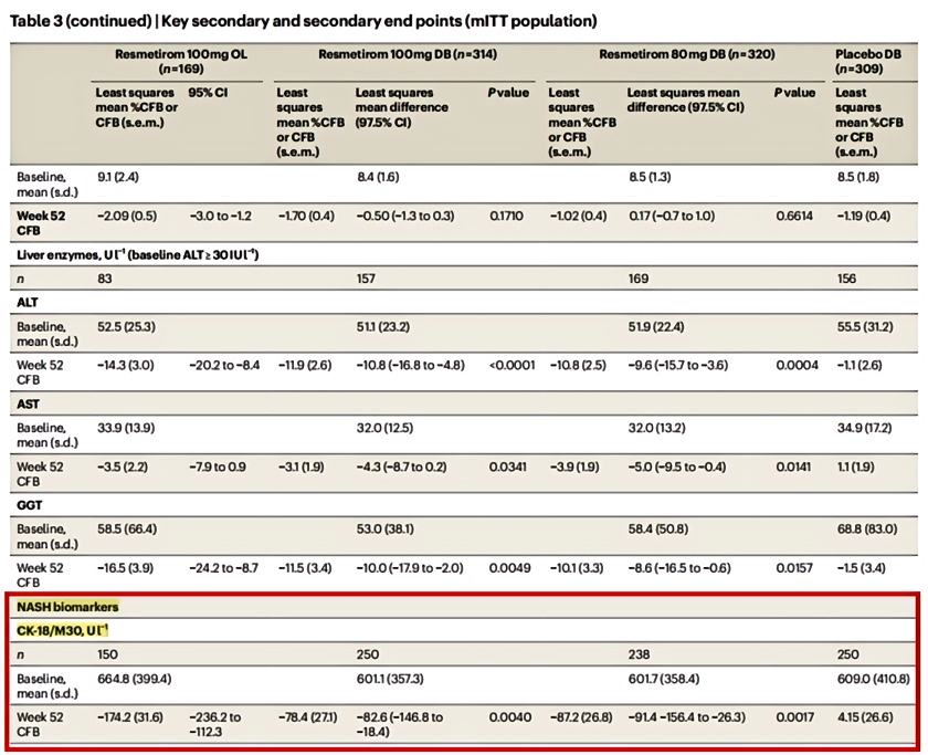 在接受Resmetirom不同劑量的治療組中,CK18的下降幅度顯著(zhù)高于傳統肝功能標志物[2]