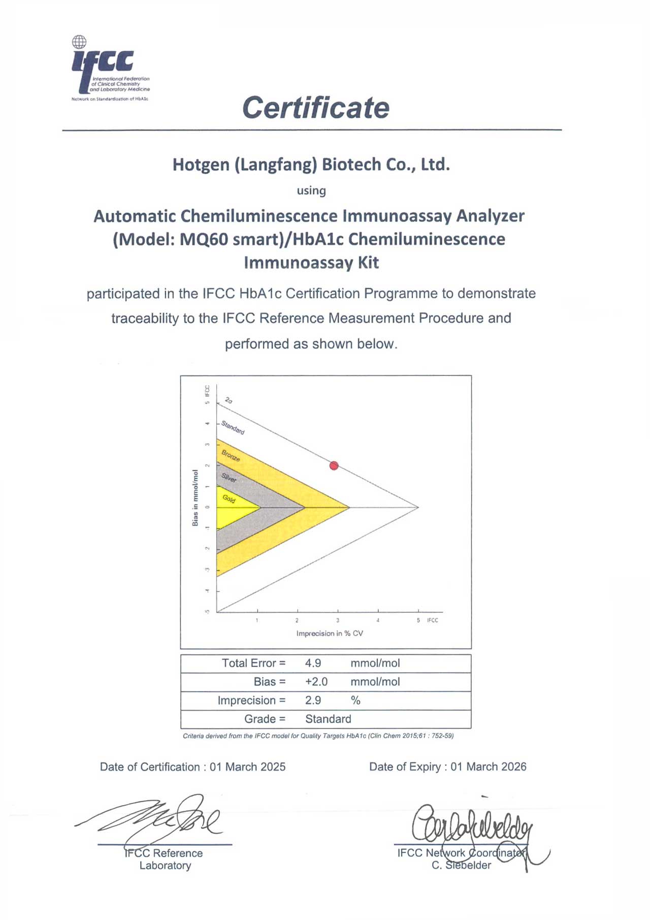 近日,熱景生物單人份化學(xué)發(fā)光免疫分析儀MQ60 Smart 檢測HbA1c獲得國際臨床化學(xué)與實(shí)驗室醫學(xué)聯(lián)合會(huì )(IFCC)的認證,確保了其檢測結果的標準化、規范化和國際化水平。同時(shí)意味著(zhù)MQ60 Smart 檢測HbA1c的檢測結果具有國際認可的質(zhì)量和可靠性。