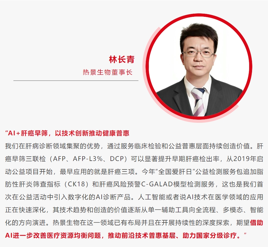 3月18日,值第25個(gè)“全國愛(ài)肝日”期間,“2025肝癌防治健康中國行——全國愛(ài)肝日”大型公益義診活動(dòng)在全國30省份近百家醫院的協(xié)同下聯(lián)合展開(kāi),惠及近萬(wàn)人次,公益健康服務(wù)包(肝癌三項、GP73、CK18-M30/M65等)由熱景生物支持。2025年升級版“肝病全周期健康檢測服務(wù)包”首次融合數智化AI診斷模型,探索“AI+創(chuàng )新診療”公益新模式,通過(guò)智能算法提升肝癌篩查效益,助力實(shí)現"篩查-診斷-干預"全流程精準管理,全面推動(dòng)肝癌防治邁入數智化新階段。