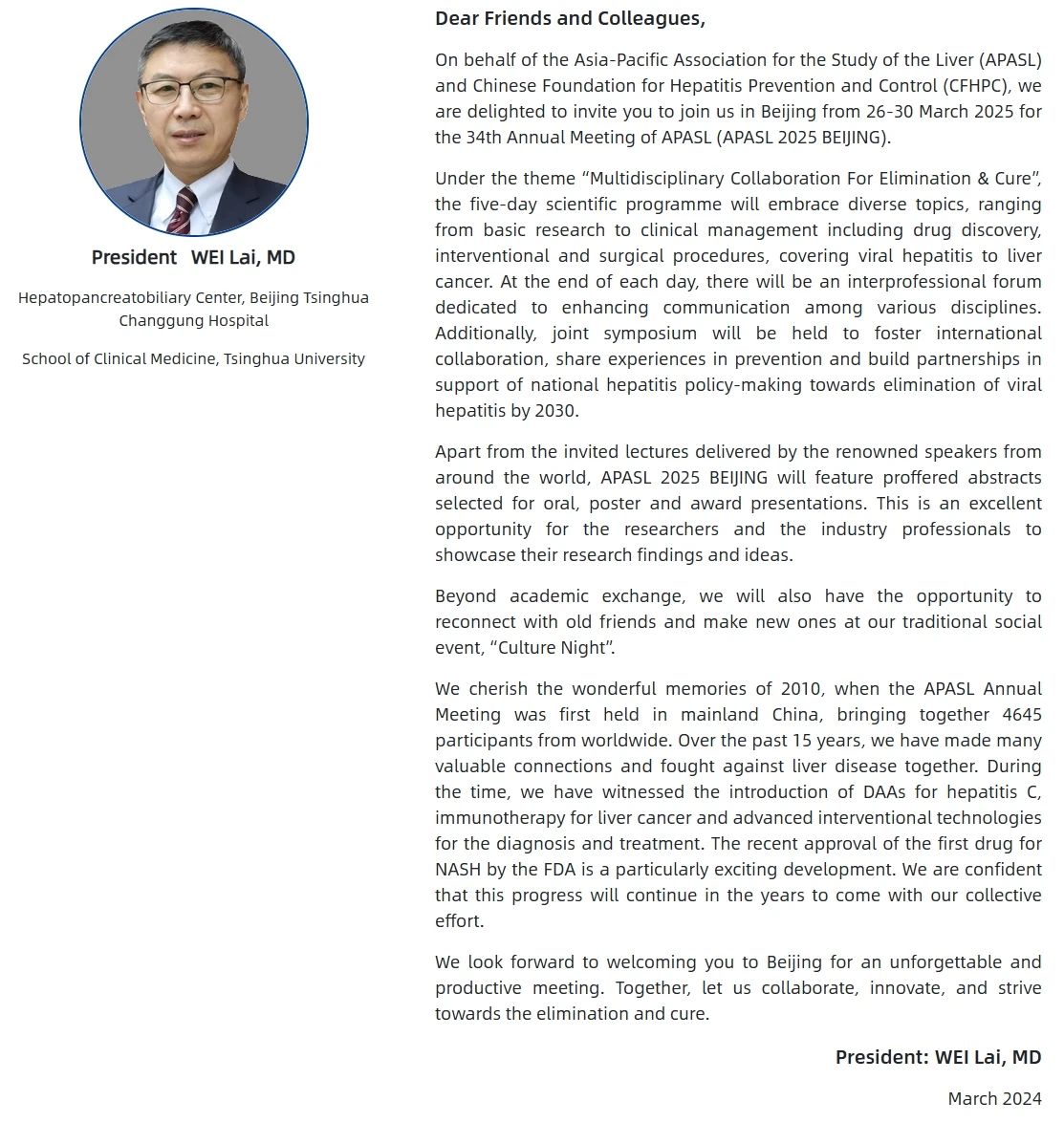 第34屆亞太肝病學(xué)會(huì )年會(huì )(APASL 2025)將于2025年3月26-30日在北京國家會(huì )議中心隆重舉行。大會(huì )以"多學(xué)科協(xié)作:肝病消除與治愈"(Multidisciplinary Collaboration For Elimination & Cure)為主題,由清華大學(xué)附屬北京清華長(cháng)庚醫院魏來(lái)教授擔任主席,將匯聚全球肝病學(xué)頂尖專(zhuān)家,共同構建跨學(xué)科協(xié)作的創(chuàng )新范式。