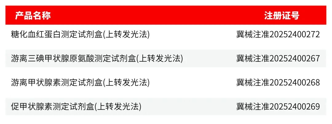 近日,熱景生物基于上轉發(fā)光(UPT)技術(shù)的 4 項醫療器械產(chǎn)品,成功拿下國家藥監局《醫療器械注冊證》!此次獲批的甲功三項(FT3、FT4、TSH)與糖化血紅蛋白檢測項目,不僅是公司技術(shù)實(shí)力的權威認證,更將為臨床診療與慢性病管理帶來(lái)便捷新選擇。